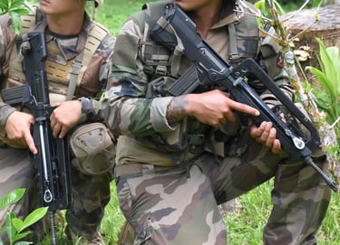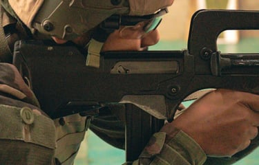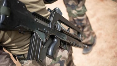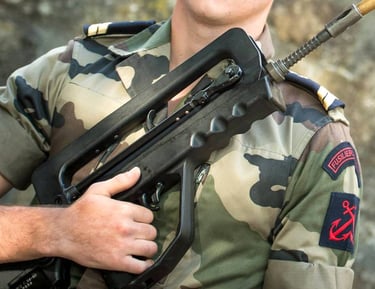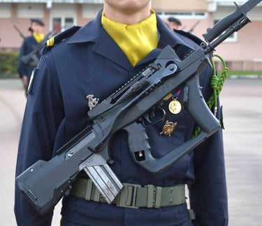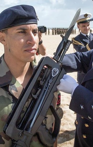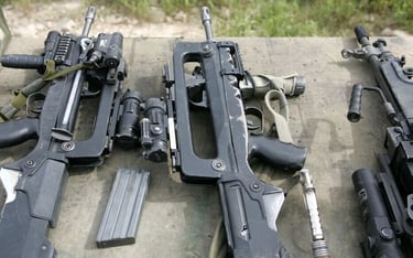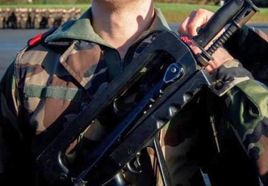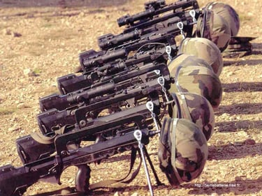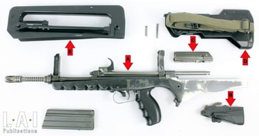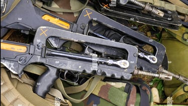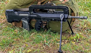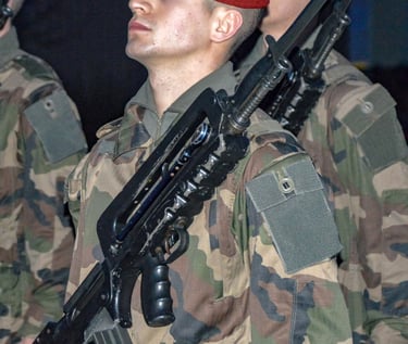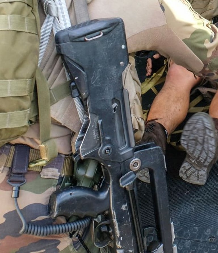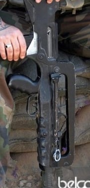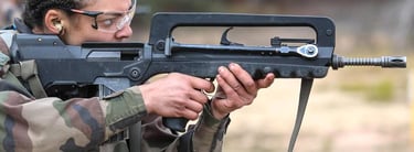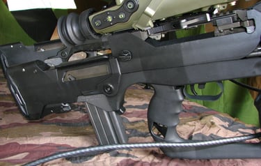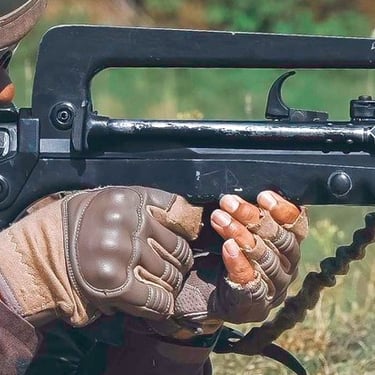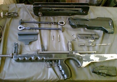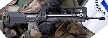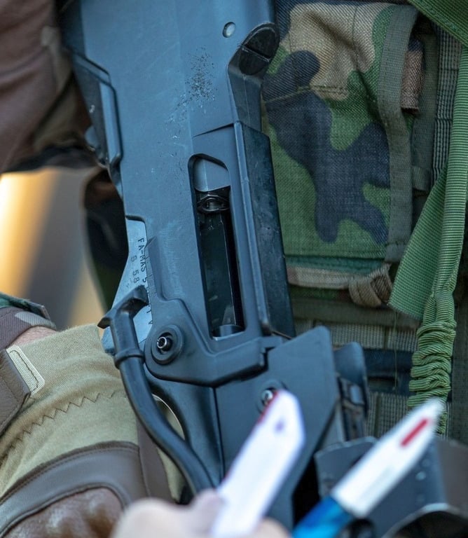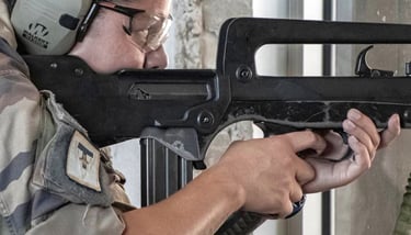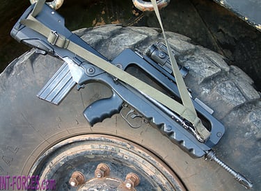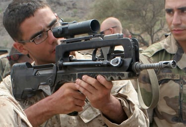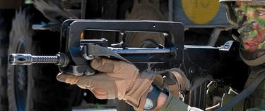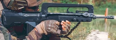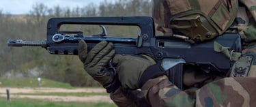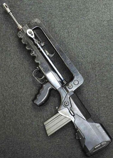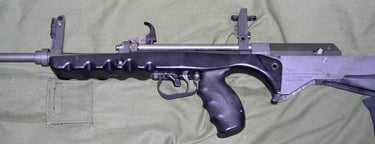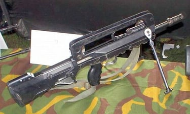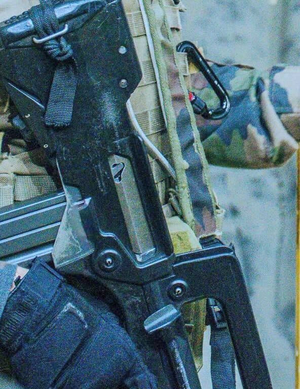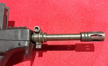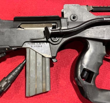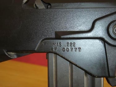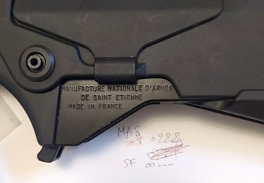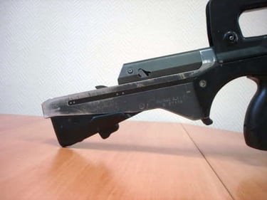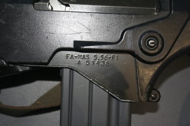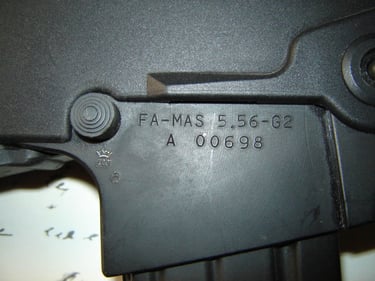 La boite de culasse (puit de chargeur visible) avait parfois un traitement de surface noir aussi. On a même l'impression qu'il s'agit d'une couche de peinture sur certaines photos de Famas F1. Enfin, même les premiers Famas G2 (canon lisse) ont un traitement de surface noir mat. Tout comme les 222 civils.