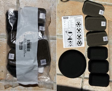 Assez classiques, on a 1 rond central et 6 rectangles. Les pads sont noirs coté extérieur et vert coté agrippant.
