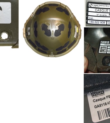 L'étiquette noire (dans l'oreille gauche) indiquait Sagem et MSA dessus et le casque se nommait "Casque Équipé".