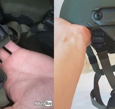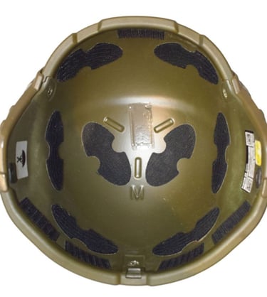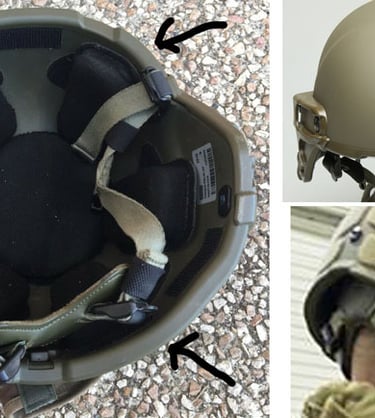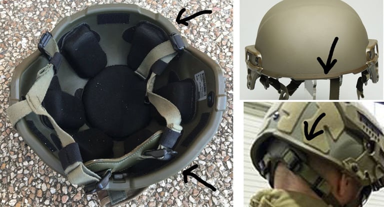 3 points de fixation (2 à l'avant et un seul à l'arrière). La "sangle" utilisé est de la toile de coton verte, le coussinet de nuque est en cuir vert et la bouclerie plastique est de couleur noire. La mentonière est constitué de 2 "sangles" et non d'une mentonnière moulée comme sur le TC NVG / VPADS.