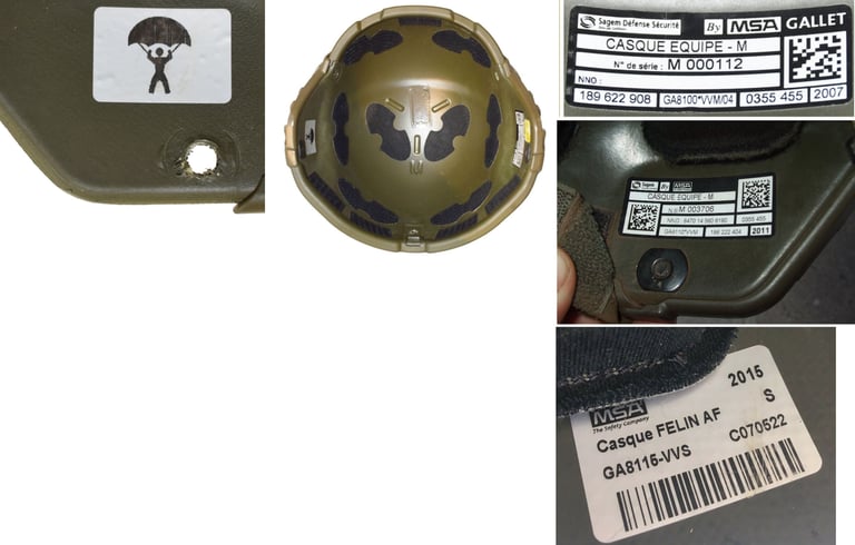 Puis l'étiquette de parachute et l'étiquette noire disparurent pour ne laissait qu'une étiquette blanche (coté gauche) avec juste MSA comme fabricant et le casque se nomme alors "Casque Félin AF".