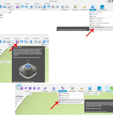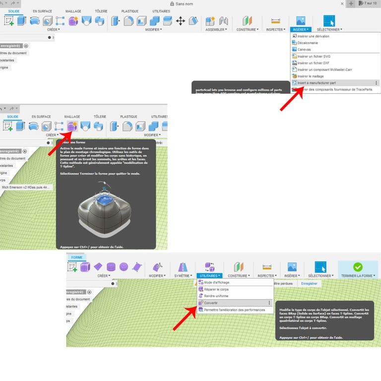 Puis on va cliquer sur "forme", la modélisation organique. Dans les outils, il y a "utilitaires" et là-dedans, il y a l'option "convertir".