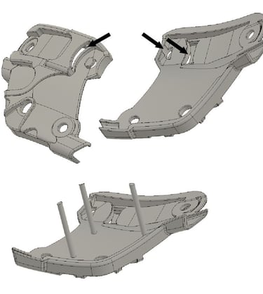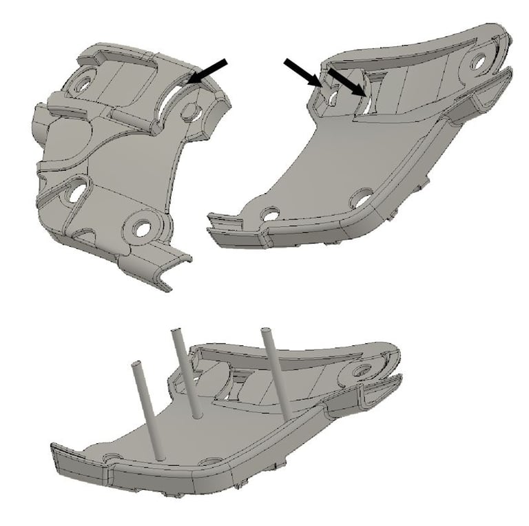 Pour la plaquette, l'aileron pose problème pour le moulage. Du coup j'ai fait une ouverture sous l'aileron (cf les flèches), ça simplifiera le moule de tirage. Et je prévois de faire des puits de chargement, la face avant en bas, la face interne pourra être pleine de bulle de dégazage, ça ne se verra pas du coup. enfin c'était l'idée de départ.