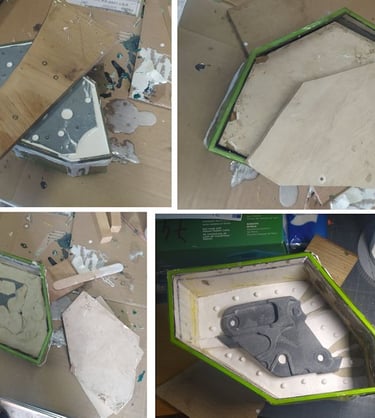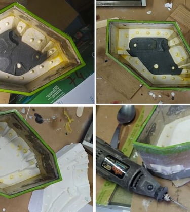 Une fois la partie "basse" du moule faite en élastomère, je retire le fond de la boite pour retirer la plastiline. Et une couche d'agent démoulant avant de passer faire la 2ème partie du moule en élastomère.