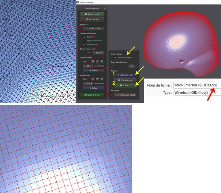 Le fichier obj créé sur Artec Studio est un trimesh (un maillage de triangle donc des faces à 3 cotés). Si vous ne le simplifiez pas, vous verrez que lesdits triangles forment des carrés ou presque. Le fichier non simplifié est donc pas mal d'origine pour être exploitable en quadmesh (maillage en face à 4 cotés, carrés ou rectangles).