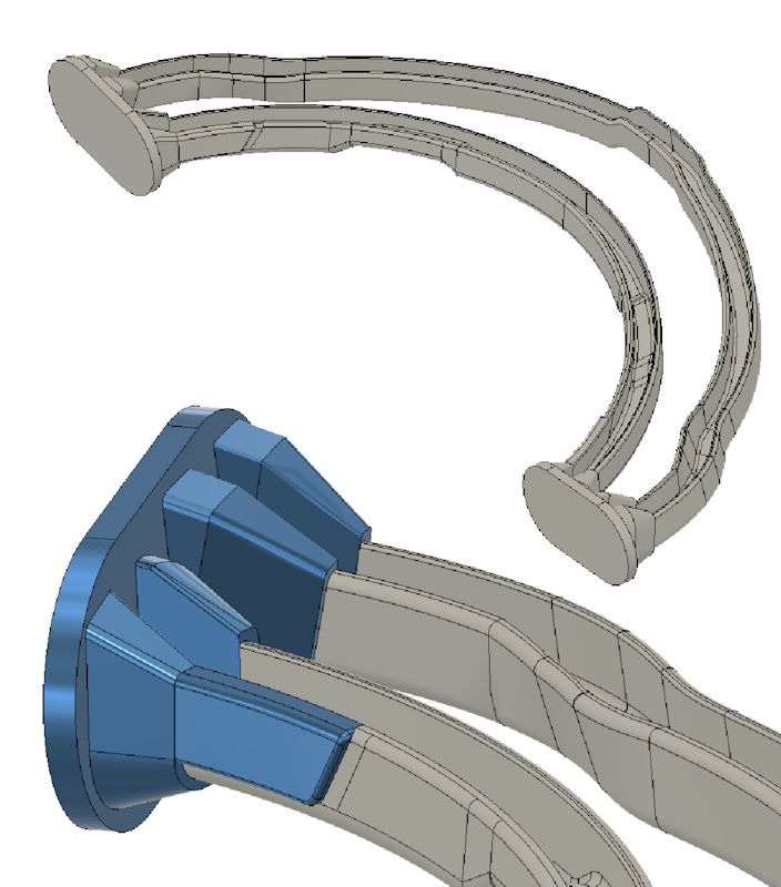 Cette fois je tente le moulage. Du coup je vais modélisé des modèles positifs pour couler de la résine dans le moule de tirage. Ici c'est le modèle positif pour couler les joncs. La partie bleu sera à couper à la fin mais permet possède une forme évasé un peu comme un entonnoir pour faciliter la coulée.