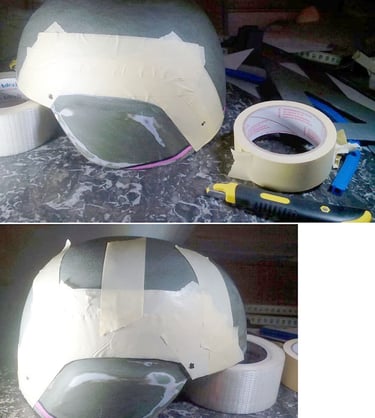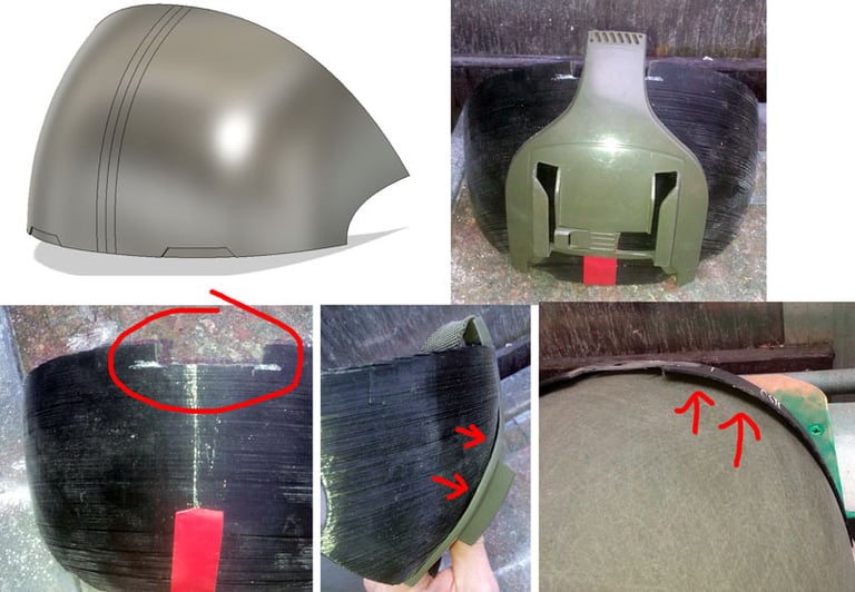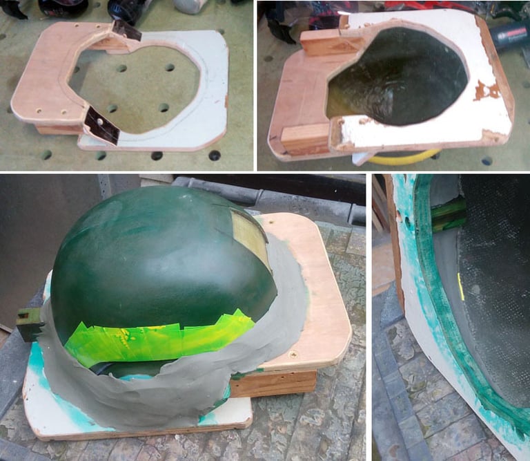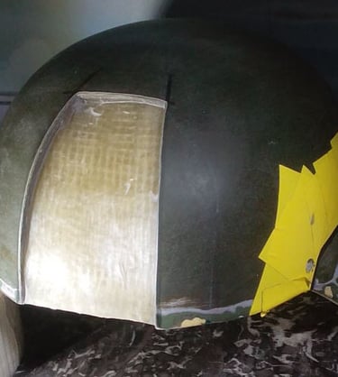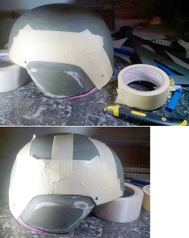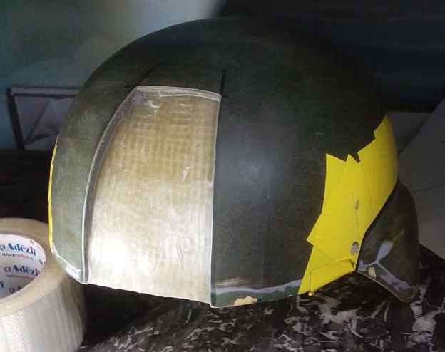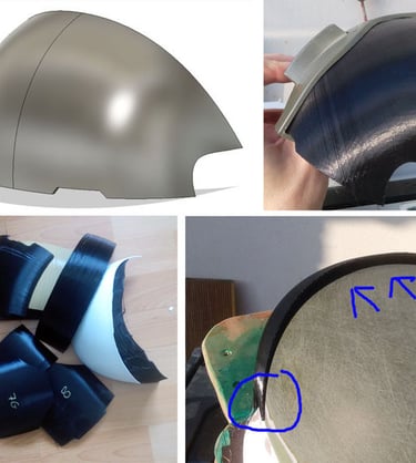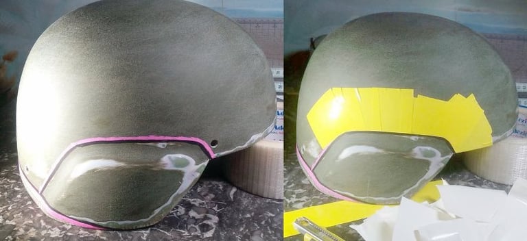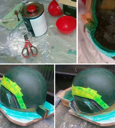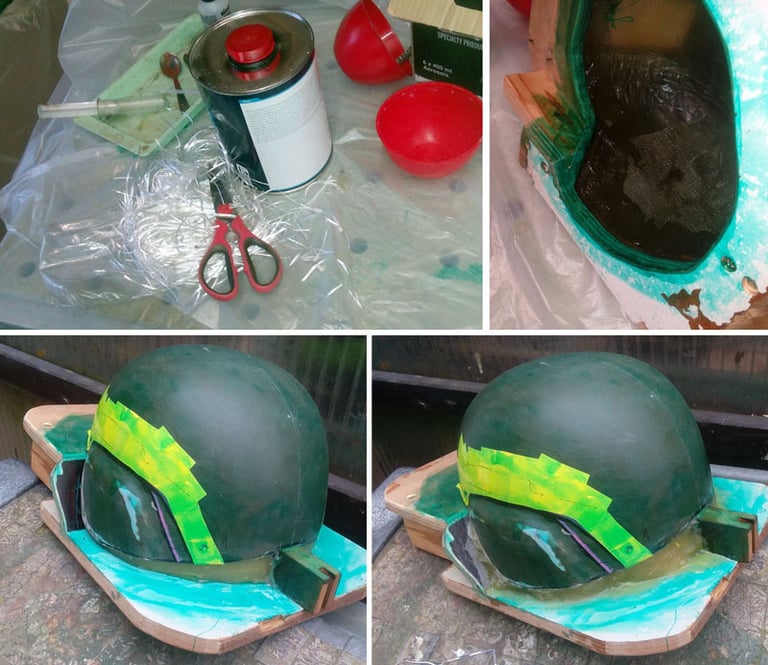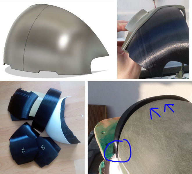Un peu de plastiline sur le casque, pour donner une forme grossière à suivre. Ensuite j'applique une 1ère couche de résine seule au pinceau, pour éviter d'avoir des trous/bulles sur la face externe et ensuite je dépose les bouts de tissu de verre. Pour limiter l'épaisseur et diminuer la quantité de résine, je dépose le tissu sec (sans le tremper préalablement dans la résine), je trempe mon pinceau et je presse/peint sur le tissu avec ledit pinceau. Il y a en gros 3 épaisseurs de superposition de fibre partout et juste 60ml de résine.