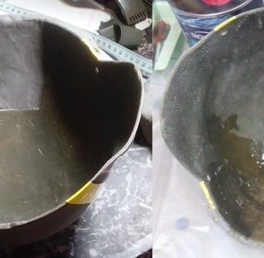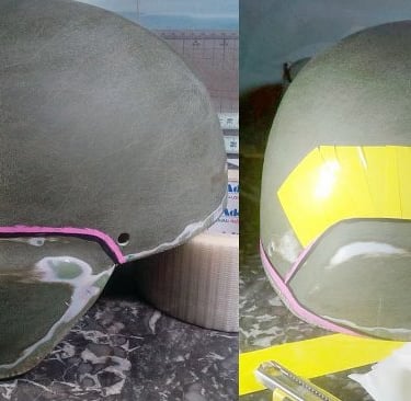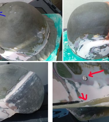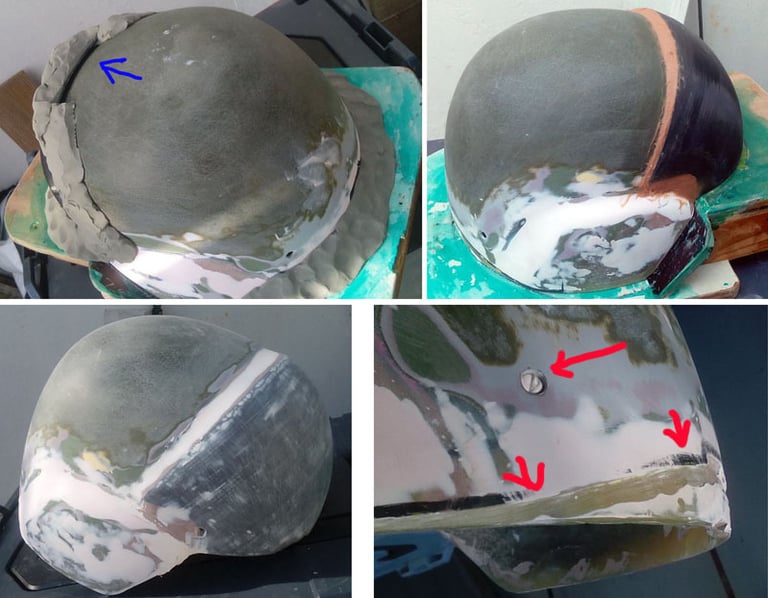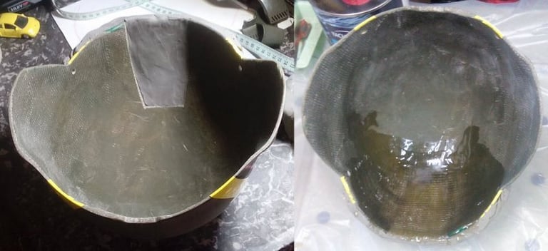 J'ai ainsi coulé 150ml de résine pour coller ledit front et j'ai tout de suite enchainé en mastiquant le bord du front pour donner le biseau/chanfrein entre ce dernier et la coque du mich (la partie marronnasse claire sur la 2ème photo)