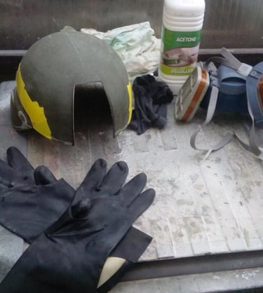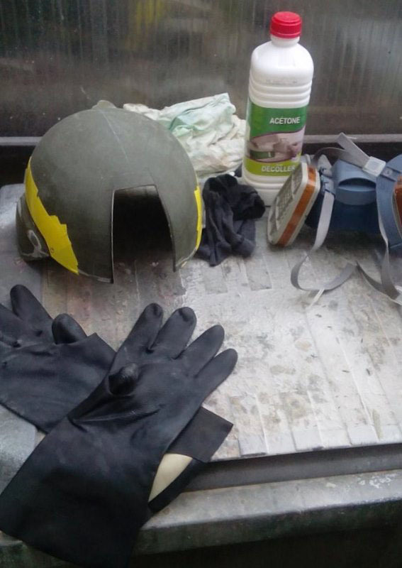 Pareil, portez des EPI adaptées. Le masque, ce n'est pas des filtres à poussières qui protègent des vapeurs nocives. Et ne prenez pas de gants vinyles, l'acétone attaque les matières plastiques. Donc des gants pour produits chimiques, c'est mieux.