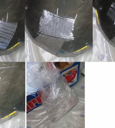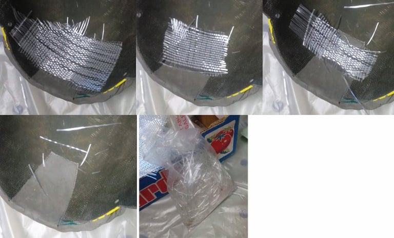Pour les casques, vu qu'il n'y a rien de plat, il faut travailler avec des petits bouts de tissus de verre. Trop grand, trop large, il ne vont pas épouser la forme. Je vous montre ici les "tailles" grossières que j'ai préparé. En sachant qu'il y en a plus d'une de chaque. Et quand on coupe/manipule le tissu de verre, il y a toujours des chutes, comme vous pouvez le voir, rien que le fait de les poser dans le fond du casque, j'en perd. Ces chutes, je les récupère dans un sachet. Ça permet de faire de la choucroute de verre en les coupants en tout petit brins. Rien ne se perd!
