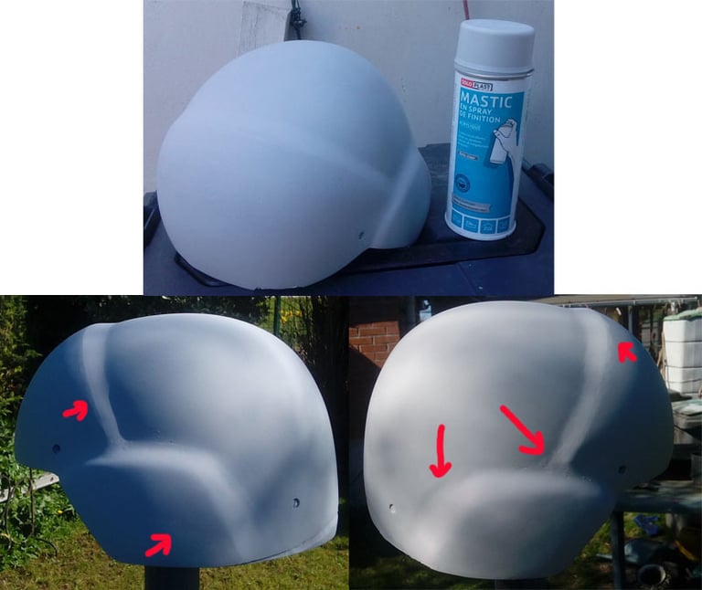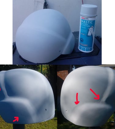 Ce WE, le résultat est pas mal, du coup je passe à la super-finition. Un coup de mastic de finition en bombe. Déjà en ayant une couleur unie sur le casque, je verrais déjà mieux mes défauts à l’œil nu. avec le jeu de l'ombre et de la lumière su soleil qu'il y a enfin en ce moment, je peut bien voir les défauts sans faire au jugé en caressant mon casque.