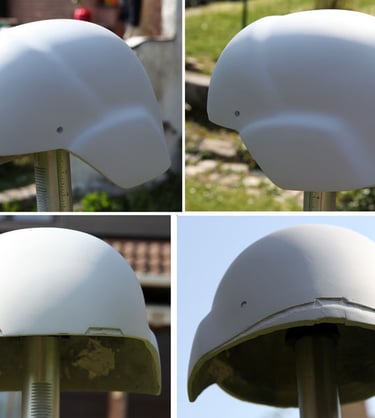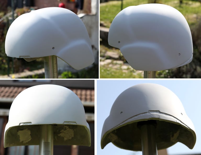 Comme dit précédemment, j'ai eut un vrai casque entre les mains. Du coup je retrace l'arrière avec mon gabarit, un coup de disqueuse et de lime électrique et voilà. L'arrière à la forme de l'original. Car l'arrière est fort relevé sur le vrai, comme on peut le voir sur la photo photo du dessous, ce qui est très différente du MICH.