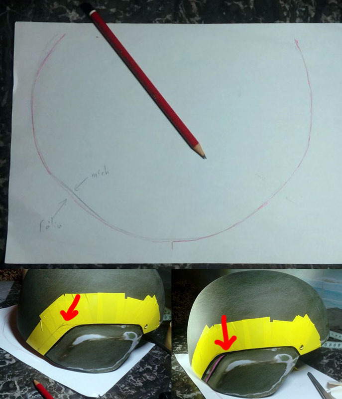 Je repère la zone ou le casque dépasse le tracé du TC Félin. Puis pour ne pas trop me prendre la tête, le plus important, c'est d'avoir la forme au contact de la griffe Lucie. Du coup je dessine la griffe, je regarde un peu et je décide en partie au pifomètre la zone à couper dans le mich pour aller au mieux avec le bombé de la griffe.