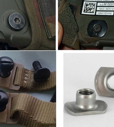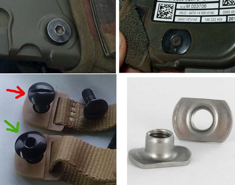 J'ai opté pour des vis noires (diamètre 6mm comme l'original) à tête poêlier (bombé sphérique) et empreinte hexagonale en 3 tailles (flèche verte). Du 14mm pour remplacer les 4 vis sur le harnais en X ainsi que du 10 et du 12mm de long pour mes 2 vis en bas de plaquettes. Comme ma coque varie entre 3 et 6mm d'épaisseur, mieux vaut prendre 2 tailles plutôt que de m'emmerder à retailler et repeindre les vis à chaque fois. Le but, c'est d'avoir une longueur de vis qui ne dépasse pas exagérément de l'écrou (ce qui pourrait éventuellement nous blesser).