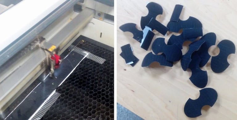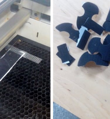 Comme j'ai un peu de velcro noir adhésif en 5cm de large et que je passe au TechShop, j'en profite pour faire mes découpes. comme ça, j'ai mes réglages de laser pour la future découpe en série.