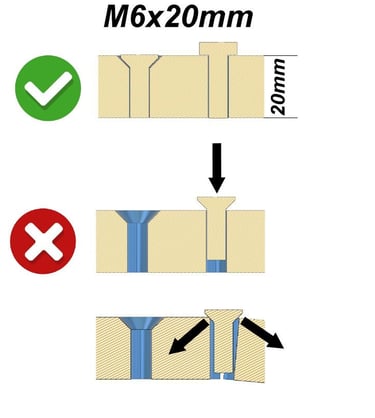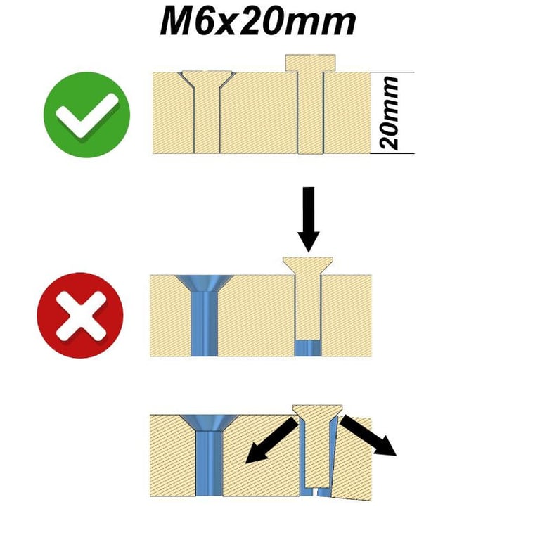 En effet, si vous forcez, la tête conique va vouloir pénétrer dans la matière et se forcer un passage en repoussant la matière au risque que la matière se fende et casse pour laisser passer le volume de la tête de vis faite dans une matière plus solide (acier).