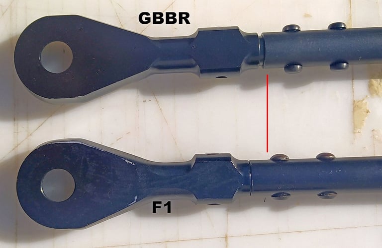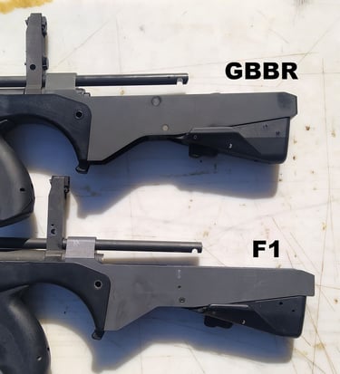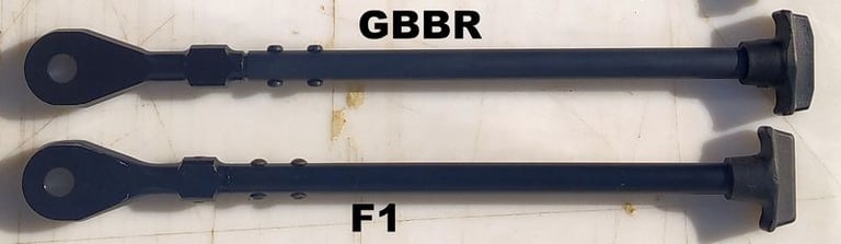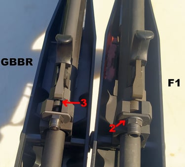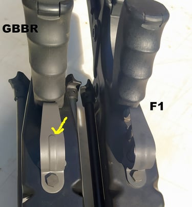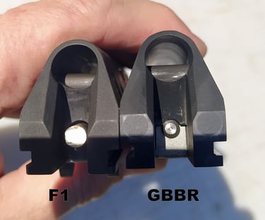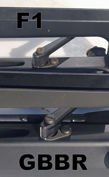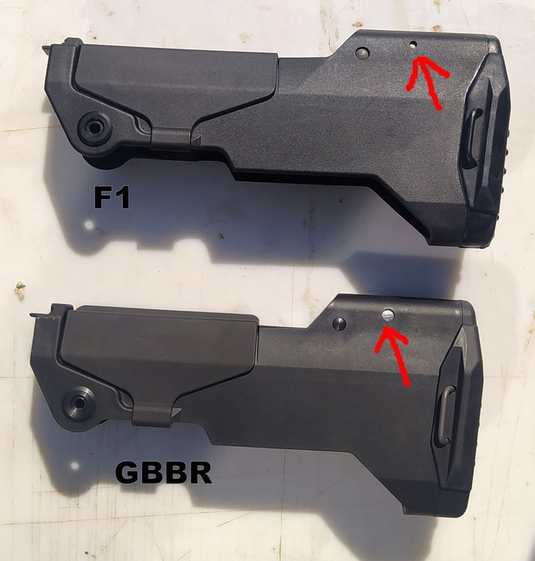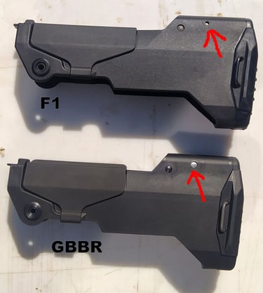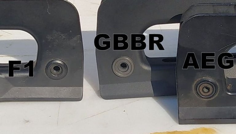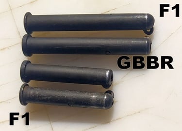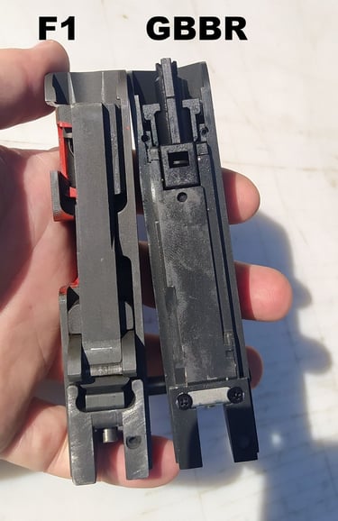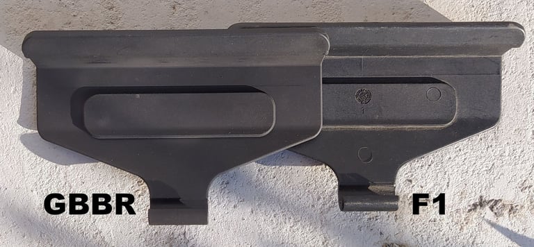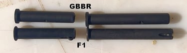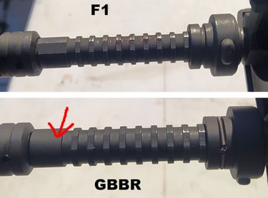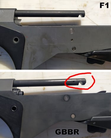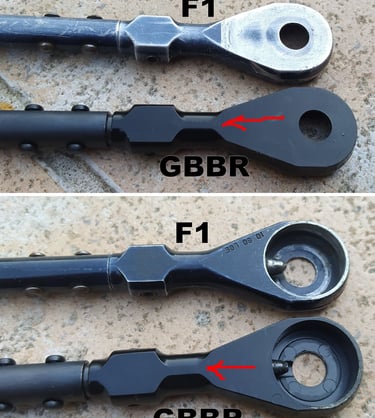 Le trou de passage de la goupille à l'arrière n'est pas du même diamètre sur le GBBR. Sur le F1, il est prévu des bagues en plus, d'ou le plus gros diamètre.