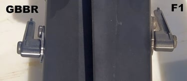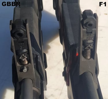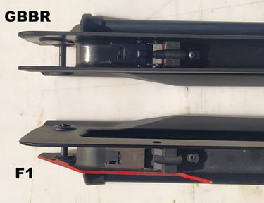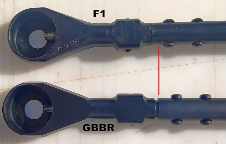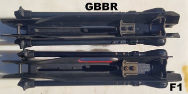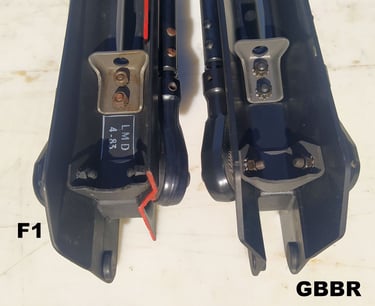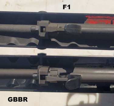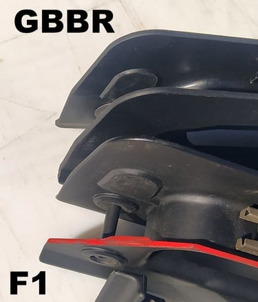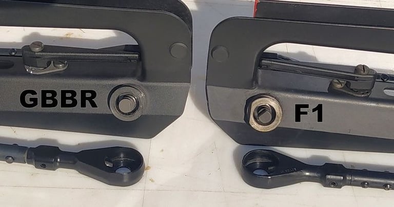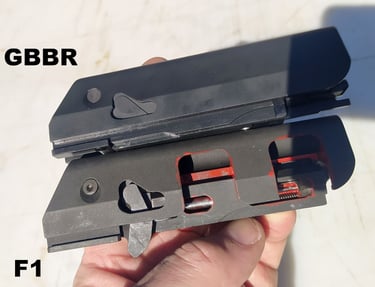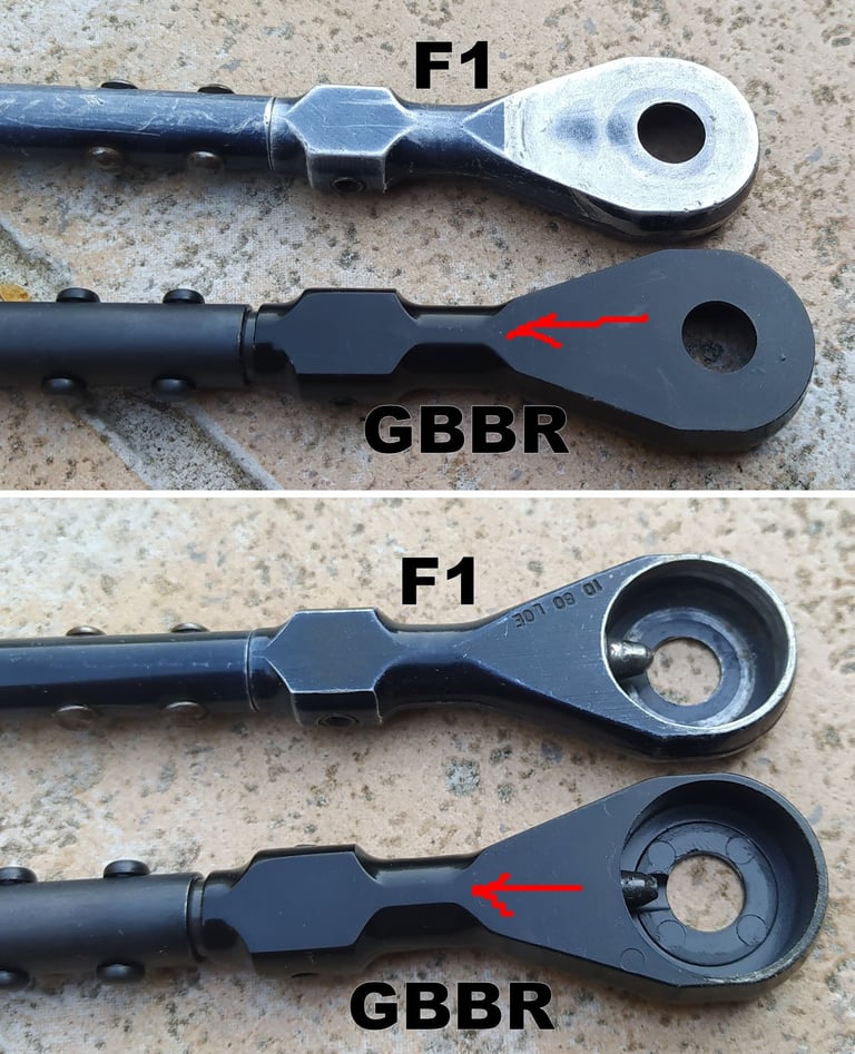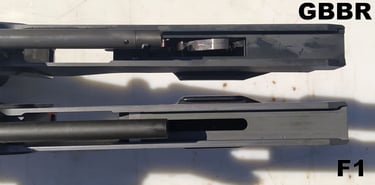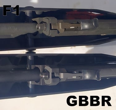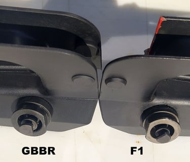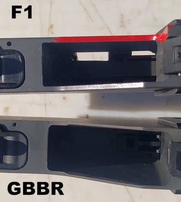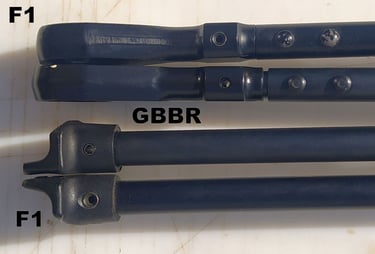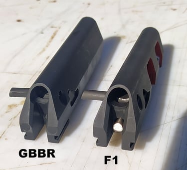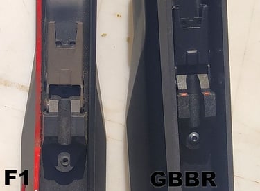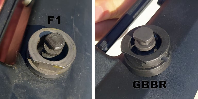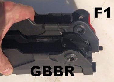Le trou de passage de la goupille à l'arrière n'est pas du même diamètre sur le GBBR. Sur le F1, il est prévu des bagues en plus, d'ou le plus gros diamètre.