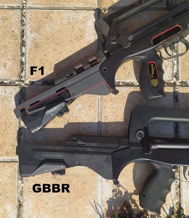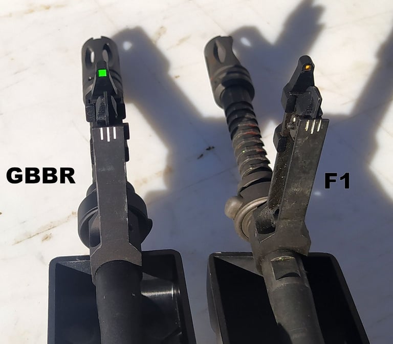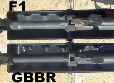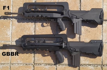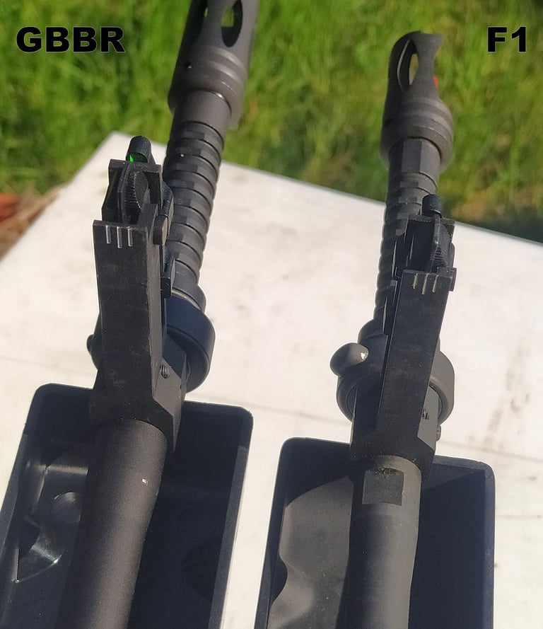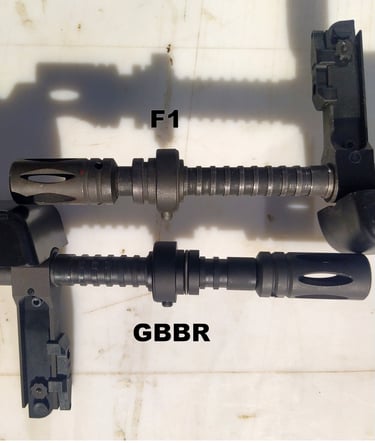 Le méplat sur le haut du canon continue jusqu'au cache-flamme sur le F1 alors qu'il se limite au crantage sur le GBBR.