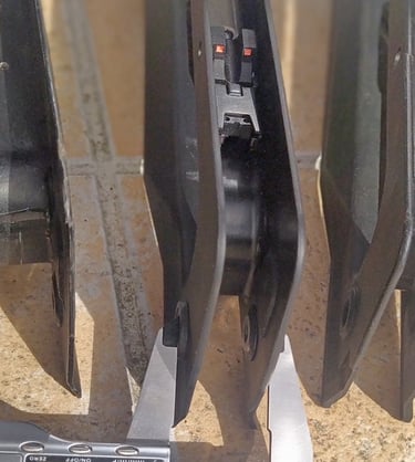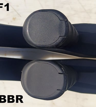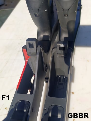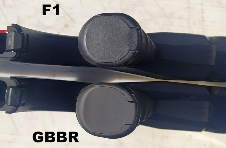A l'avant les tampons sont pas mal. On notera que sur le GBBR il y a 13mm de distance intérieur (écart entre les tampons) pour passer le porte-guidon contre 13.5 à 14mm sur le F1 (selon la PGM). Avec un porte-guidon qui est plus large aussi sur le GBBR, ça réduit encore un peu le jeu pour insérer la PGM (en gros il y a 1mm de jeu latéral de chaque coté du porte-guidon sur le GBBR contre 2mm sur le F1). Sauf que.... les tampons frottent sur le coulisseau de tir de nuit qui, lui, fait 14mm de large. Les tampons du GBBR étant plus souple, ça frotte légèrement mais sur les vrais PGM avec leurs tampons bien durs, ça gène réellement l'insertion. Cf 3.2.1- PGM.