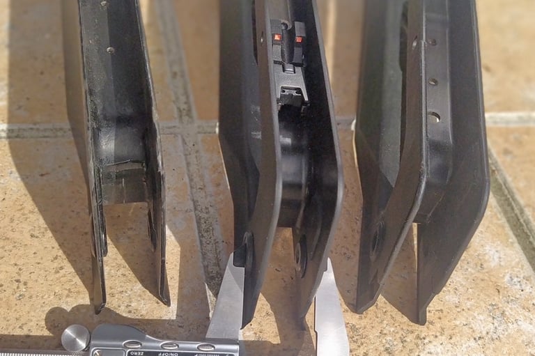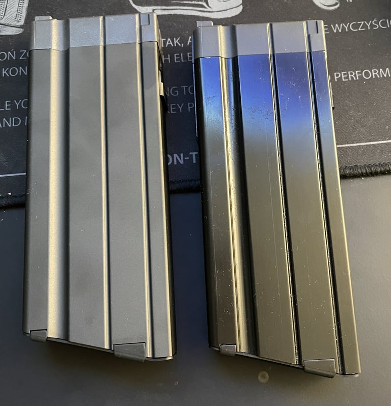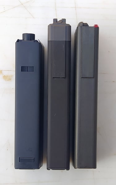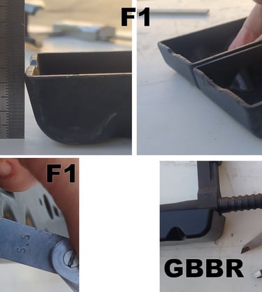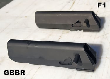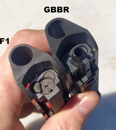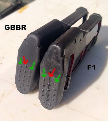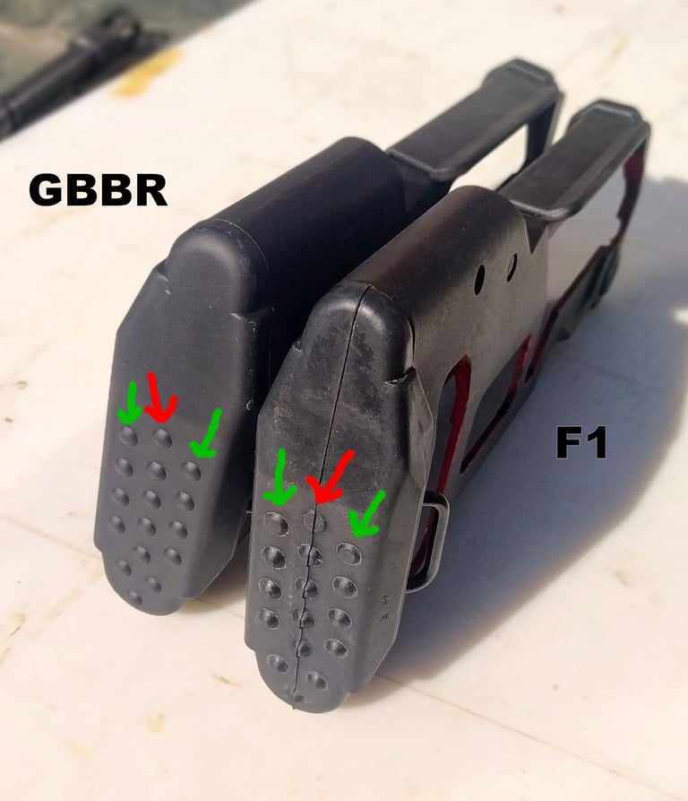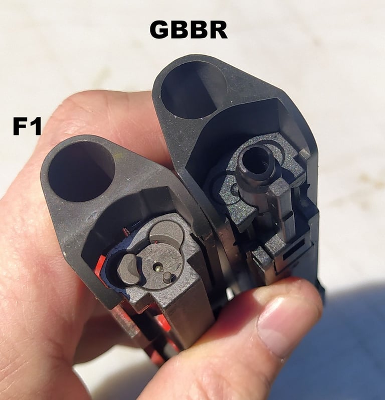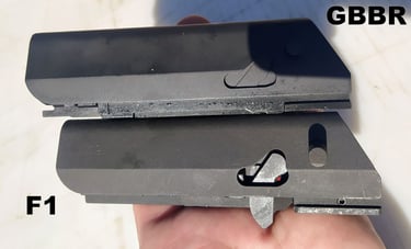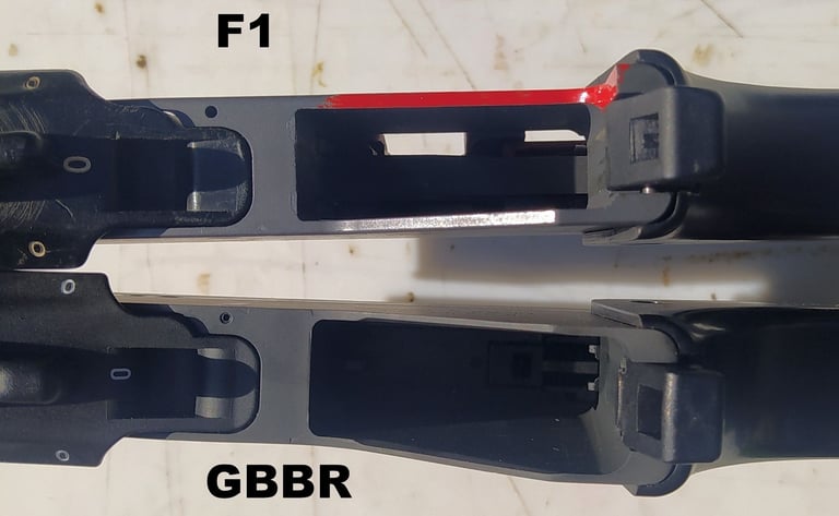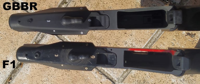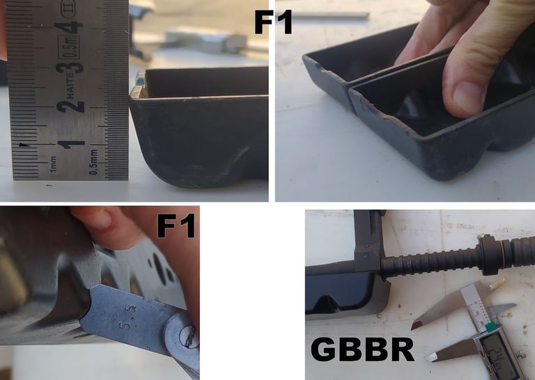 Les parois du puit de chargeur font 3mm sur le F1 contre 2mm sur le GBBR. Et sur le GBBR, il y a une légère dépouille (un biseau sur le bord) qui fait croire que les bords sont encore plus fins mais c'est avant tout pour aider à l'insertion du chargeur gaz.