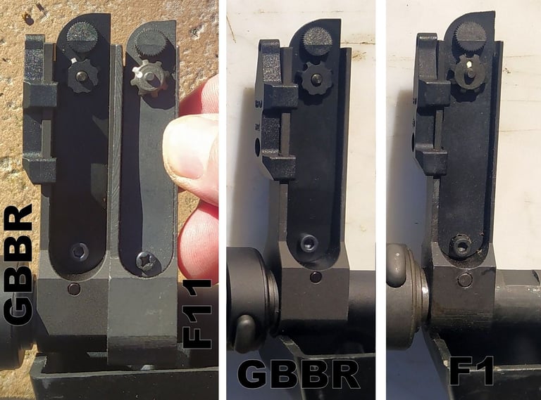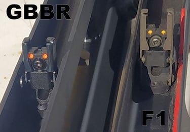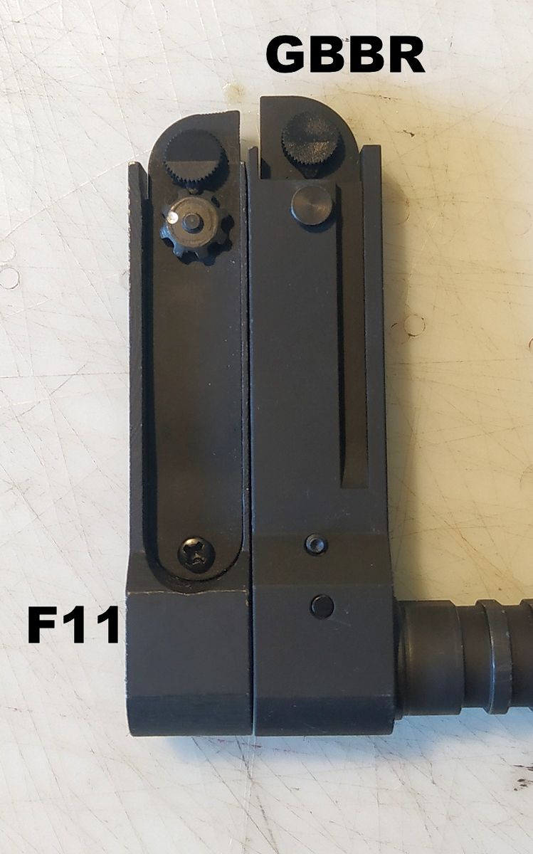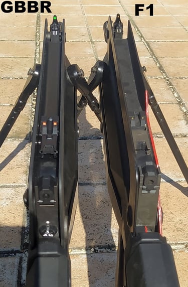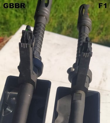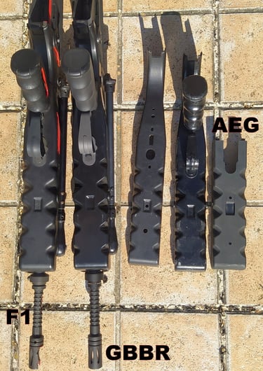 De l'extrémité du cache-flamme au bord du porte-guidon, j'ai 148.5mm sur le GBBR contre 145.5mm sur le F1. Bref, +3mm d'écart de longueur.