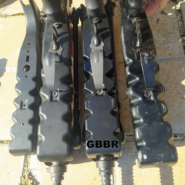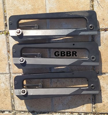 La seule remarque que je ferais est que l'écart entre l'étrier et le renfort de PGM (les 2 pièces métalliques à l'avant) est de 89mm sur le GBBR contre 86 à 87.5mm sur les PGM F1 en résine. Ca laisse, là-aussi, moins de place pour insérer la PGM. Cet écart correspond à celui des PGM de F1 en plastique sauf que... sur les PGM F1 plastique, l'étrier est à l'envers (du coup, là, ça facilite l'insertion contrairement à ici sur le GBBR).