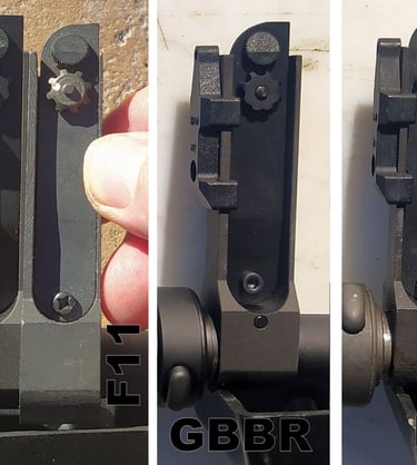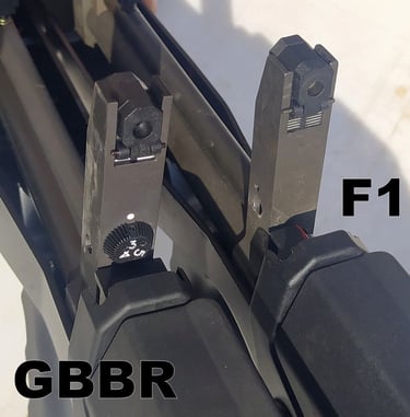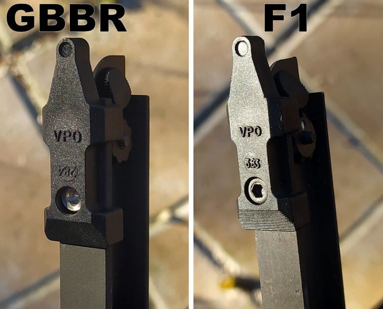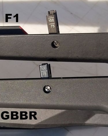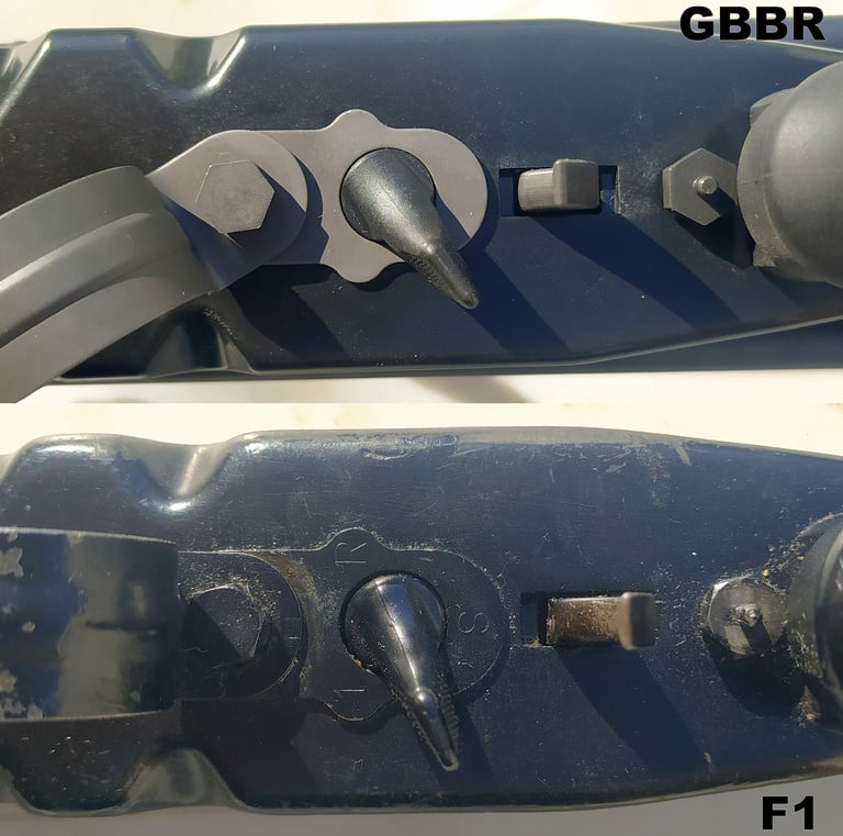 Et si vous regardez bien, vous verrez que sur le F1, la plaque d'indexation d'arcade de pontet est gravée (1, S, R). Le gravage n'a pas été reproduit sur le GBBR, mais qui le remarquera de toute façon (à part les puristes)?.