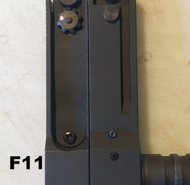 L'alidade de tir tendu/de nuit a des carrés de couleurs plus gros que sur le F1. Il est un peu plus mastoc avec quelques différences légères et il est vissé alors que sur le F1 il est riveté. Par contre ce sera pratique pour le retirer car, comme pour le coulisseau sur le porte-guidon, il a été retiré après 2002 sur les F1 (à cause de la présence du tritium).