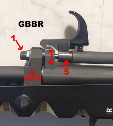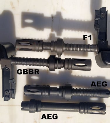A l'avant, la longueur du "bloc" (n°6) sur le GBBR est de 16.4mm contre 17.45mm sur le F1. Par contre la distance entre la tourelle porte-œilletons et la partie "tubulaire à insérer" de l'écrou de tige guide (n°1) est respectée. Comme ça au moins, pas de soucis pour installer les PGM. Cet écrou de tige guide (n°1) fait 8.85mm de diamètre sur le GBBR contre 8.9-8.95mm sur le F1. Ca donne un peu trop de jeu à la PGM à mon gout mais tant que vous laisser le coulisseau de tir de nuit, la PGM est calé avec les tampons avant.