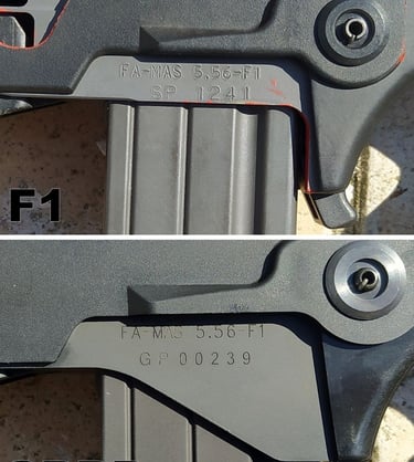 Sur le 1er batch (la 1ère pré-commande), le marquage était bien plus réaliste: "D 19***", une copie conforme de n° de série de Famas F1 Français.