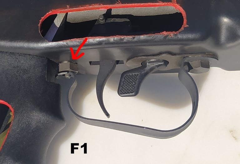 Pas mal de petits écarts par rapport au F1, mais l'essentielle, c'est que ce soit fonctionnel pour jouer avec. Donc ça reste un super boulot. L'ensemble correspond grosso merdo à la 3ème version du mécanisme d'armement. Certaines pièces, comme le levier d'armement sont sous dimensionnés, d'autres ont un aspect "fantaisistes" (en tout cas inconnu pour moi) : Cf n°1 à n°7 sur les photos. Notez enfin que le levier d'armement du F1 possède un marquage.