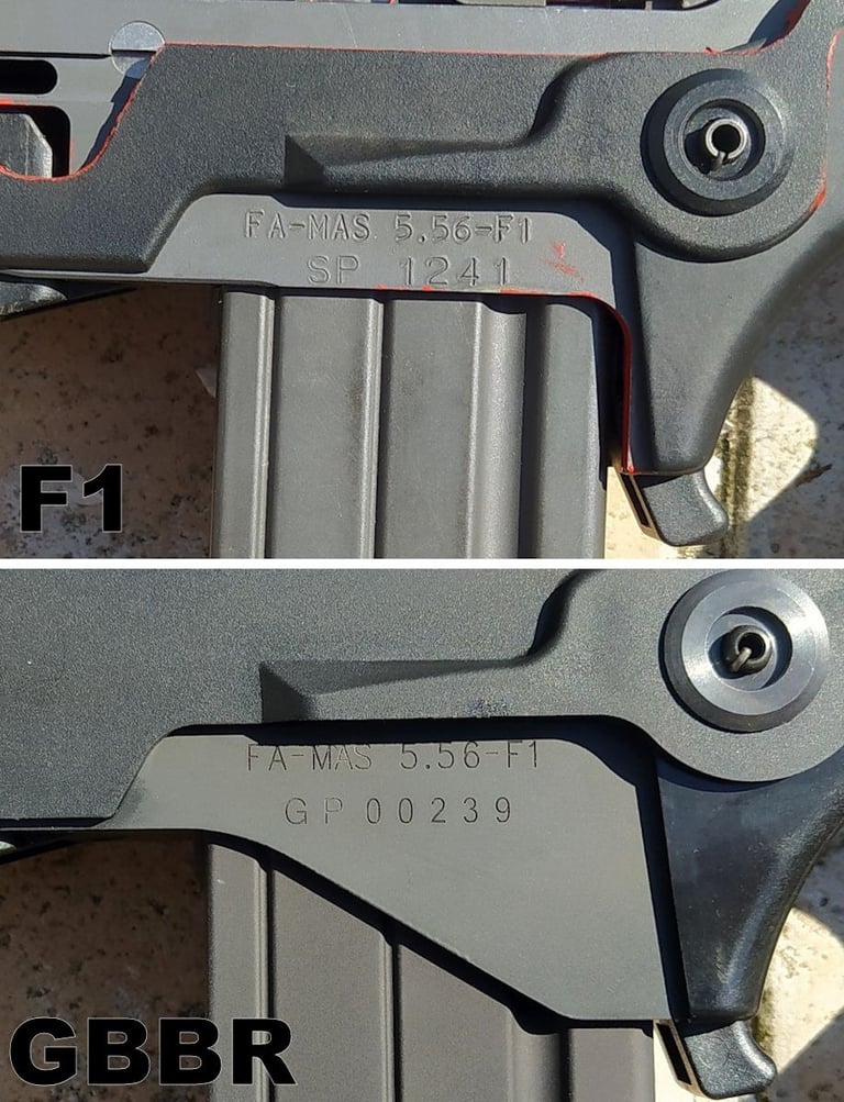 Les marquages originaux sont des marquages frappés sur le F1. Sur le GBBR, ils sont gravés. La hauteur de lettre de 3mm est respecté. Sur mon didactique, la longueur du texte "FA-MAS 5.56-F1" fait 41mm, sur le GGBR, il fait 39mm.