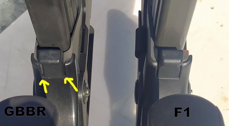 Sur le GBBR, il y a un peu trop de jour sur les cotés entre le crochet de chargeur et le fût comparé au F1.