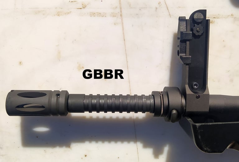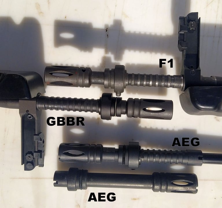 Le diamètre du cache-flamme est respecté (21.95 à 22.05mm sur le GBBR contre 21.75 à 21.95mm sur le F1). Par contre le canon est 1mm plus épais sur le GBBR (17mm sur le GBBR contre 16mm sur le F1 ou le F11).