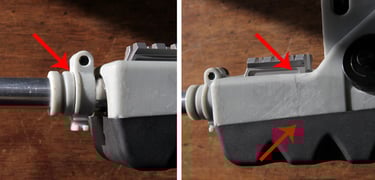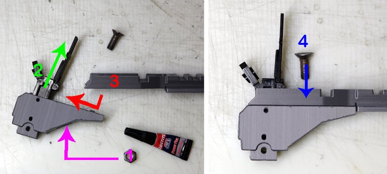 Donc il faudra juste dévisser la lame pivotante, le porte guidon et son coulisseau de tir de nuit, c'est finit, plus besoin. Il faudra quand-même couper le bas de la lame, juste en dessous de la vis car sinon ça touche le canon externe. Pas besoin d'être précis, on est pas à 1mm près cette fois.