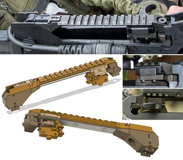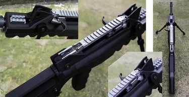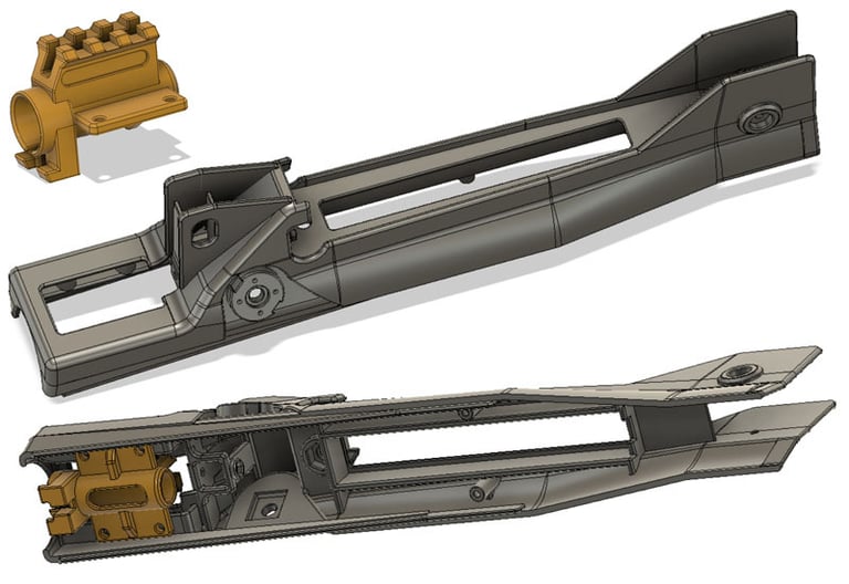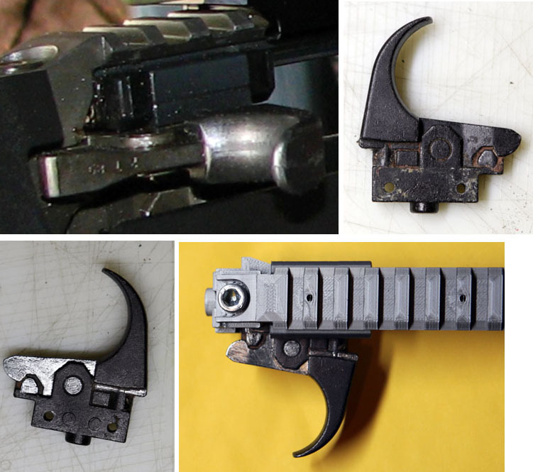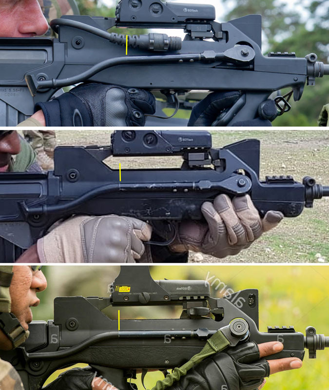 On voit bien sur les photo qu'il y a une rainure sur le "sous-rail", sous le Picatinny. Pour que le chariot avec le levier d'armement suive le rail. Et dessous il y a le crochet sur ressort comme sur le F1 à l'époque.