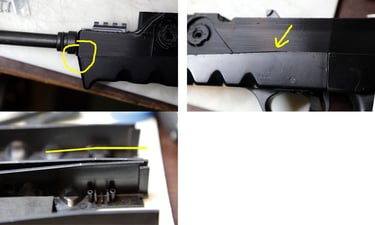 C'est cette pièce avant sur le Marui/Cyber qui est mal conçue à la base et créer les couinements. Comme elle est instable (non vissée) et solidarise la PGM et le garde main bas, on a un jeu sur 3 pièces, ce qui est trop important lors de la manipulation de l'AEG et créé des couinements.