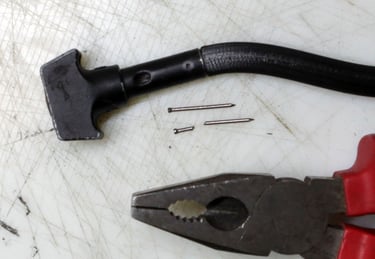 Une fois enfoncé, j'ai perc2 (à la perceuse à main cette fois) mon tube courbe imprimé et j'ai mis des micro vis. Le problème, c'est qu'une micro vis, si on force, ben elle peut casser dans le trou. Argh ! c'est ce qui est arrivé. Du coup, plutôt que de mettre des vis dont je ne suis pas sur de trouver un modèle avec une petite tête discrète, je vais plutôt coller et planter un clou pour la version finale.