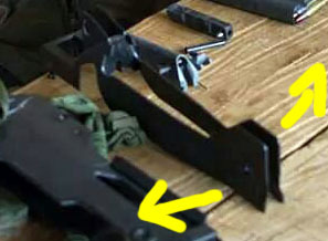 La goupille a tendance à se décrocher de la PGM quand ladite PGM s'accroche quelque part. Vu qu'elle est en gros en forme de U, les 2 branches arrières peuvent s'écarter l'une de l'autre (flèche jaune), du coup la goupille saute d'un coté. Et ce coté s'écarte du corps du Famas (élasticité de la matière). Un gros défaut de conception du coup. si vous avez la version Félin, c'est pire, car il y a un attache câble. Si ce dernier s'accroche à une branche, là, c'est sur, vous arracher le coté de la PGM (casse). C'est rare, mais ça arrive.