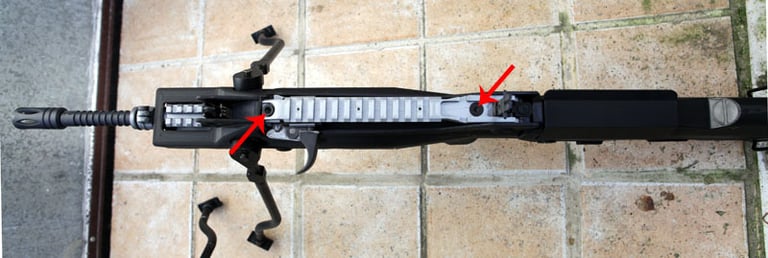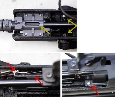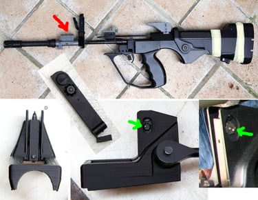 En interne, la fixation avant est spécifique Cyber ou Marui, tout comme le trou pour le bipied (flèches vertes). Ce système de fixation au canon finit de solidariser la réplique avec le canon externe.