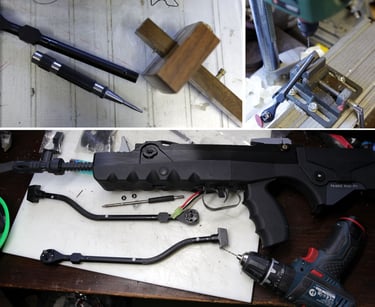 ATTENTION: pour le perçage du tube courbé et son encollage. Ne le faite qu'avec le bipied installé sur le Famas et replié. Ceci afin de ne pas vous tromper de bipied (gauche ou droit), et de choisir le bon angle sur la carcasse, bipied replié. A la limite percer les tube métallique avant, encollé dans la position replié sur le Famas et ensuite seulement clouter l'ensemble.