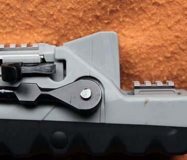 Par contre mon chariot ne ressemble pas au vrai: j'ai fait au mieux pour y adapter le faux levier d'armement et respecter les normes OTAN du rail Picatinny, c'est à dire que le rail doit faire 9.6mm de haut minimum. Hors ici, le chariot semble trop élevé pour respecter cette norme. On voit bien que l'Eotech rase la partie triangulaire du Picatinny et ne mord pas sur la partie plane verticale qui est censé faire quelques mm de plus qu'ici. Tout au moins d'après les photos.
