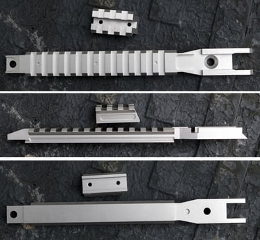 Les rails Picatinny, je les ai fait faire chez weerg.com , en alliage d'aluminium série 7000, c'est le plus résistant que je connaisse. "Ecroui" par traitement "nanosphères". J'aurai préféré anodisé, mais bon, Weerg ne le proposait pas au moment de ma commande.