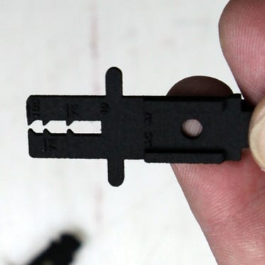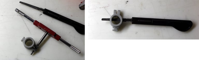 Sur les dernières photos, on voit le 1er modèle d'outil de coupe et le nouveau, avec 2 pattes supplémentaire pour bien encadrer le porte-œilletons et être encore plus précis que ce que j'ai fait.