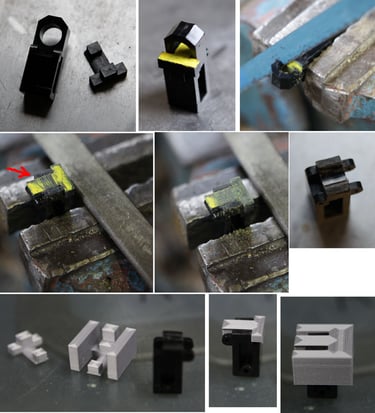 Pendant que je teste l'ajustage du "chariot" et de l'emboitement de la pièce avant qui porte le rail, je me suis amusé à gratter la peinture du faux levier d'armement. Ça rend pas trop mal.