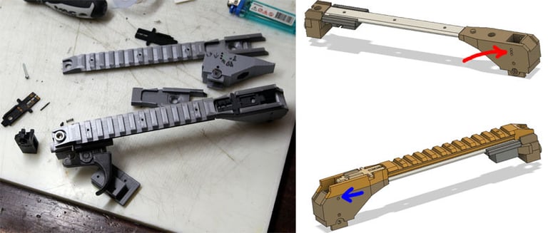 Au départ, j'avais prévu de garder le guidon de la réplique que j'aurais coupé à dimension, ainsi que sa lame pivotante. Du coup j'imaginais juste couper le haut de la pièce Marui/Cyber et l'emboiter dans ma pièce imprimée avec le rail picatinny à l'avant (flèche rouge).
