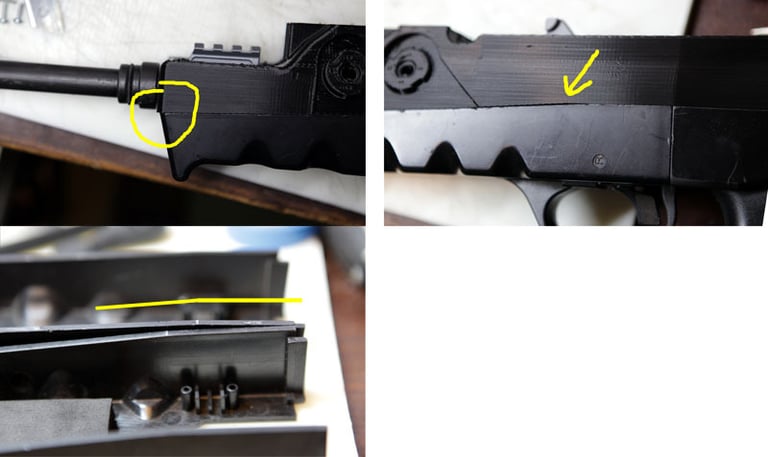 Quelques essais pour voir si les fixations tombent au bon endroit, une impression d'un premier jet de carcasse. Du coup je repère des différences entre le Marui et le Cybergun sur quelques points. Pas bien grave, on va s'en accommoder.