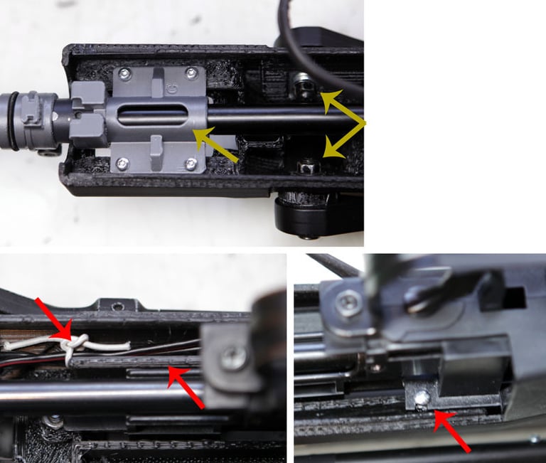 Flèche rouge, vous avez une paroi et un trou pour y passer un Colson ou une ficelle comme ici, pour caler le câblage électrique afin qu'il ne gène en rien (et donc que la gaine ne s'use pas) sur le levier d'armement mobile si vous faites joujou avec (et il ne sera jamais visible ni ne générera au montage/démontage).