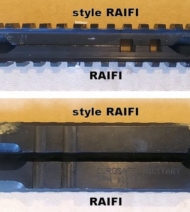 Hormis le faut qu'il possède des vis, contrairement au RAIFI (qui utilise les mollettes du Rail Supérieur officiel), le dessous est quasi identique au RAIFI. Jugez-en par vous-même.